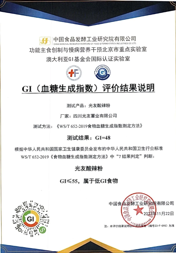 4月23日訊:近日,光友薯業(yè)收到來(lái)自中國食品發(fā)酵工業(yè)研究院GI營(yíng)養工作室的喜訊,光友薯業(yè)生產(chǎn)的明星產(chǎn)品——光友酸辣粉成功通過(guò)中國食品發(fā)酵工業(yè)研究院GI國際聯(lián)合研究與測試實(shí)驗室標準化GI測試流程,被認證為低GI食物。