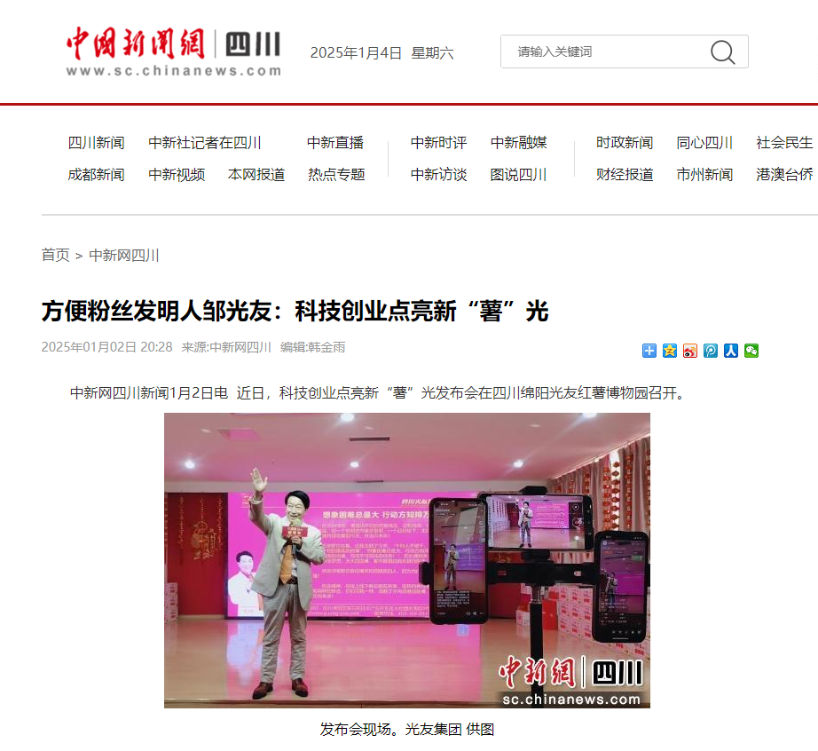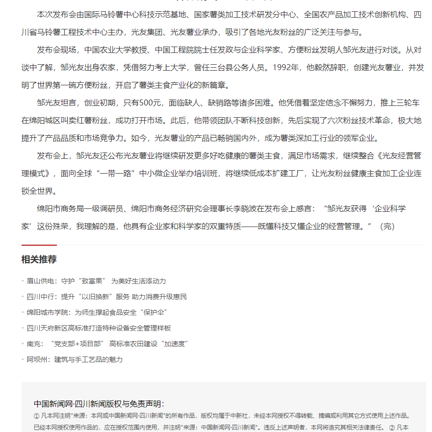 轉載中國新聞網(wǎng)·四川新聞——方便粉絲發(fā)明人鄒光友:科技創(chuàng )業(yè)點(diǎn)亮新“薯”光