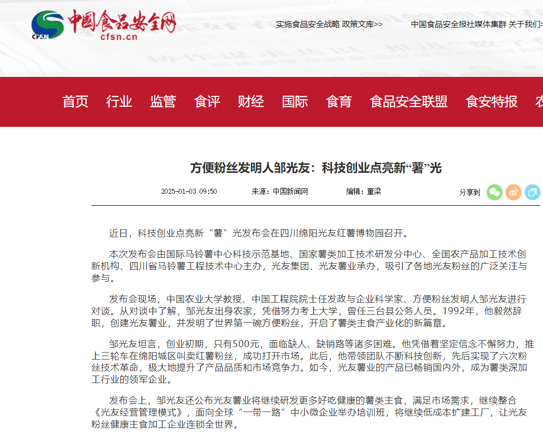 轉載中國食品安全網(wǎng)——方便粉絲發(fā)明人鄒光友:科技創(chuàng )業(yè)點(diǎn)亮新“薯”光