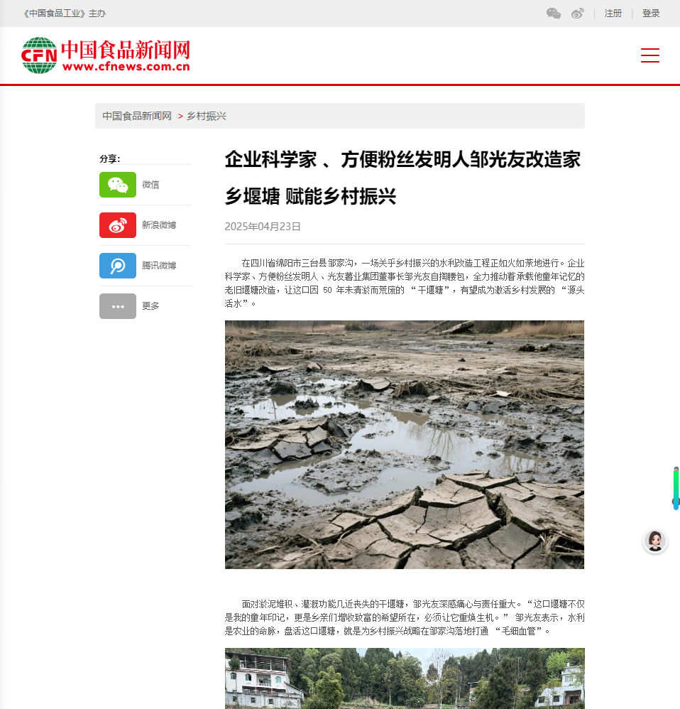 轉載中國食品新聞網(wǎng)——企業(yè)科學(xué)家 、方便粉絲發(fā)明人鄒光友改造家鄉堰塘 賦能鄉村振興